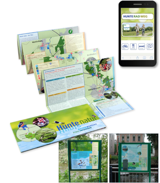 Herausragend sind die 29 Informationstafeln zwischen Hunteburg und Oldenburg, auf denen die Flussentwicklung sowie die Pflanzen- und Tierwelt der Hunte unterhaltsam vorgestellt werden. Das Konzept dafür hat die Agentur mit dem Biologen Volker Moritz entwickelt. Die Illustrationen stammen von dem Grafiker Matthias Ramsch.